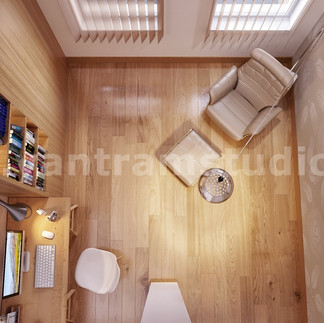 Contemporary Residential house interior design, home office library room, and loft decoration with cork board, night lamp, blank memo paper, study table, modern and dark bathroom and elegant bedroom design of Architectural Design Home Plans by Yantram Architectural Animation Studio .